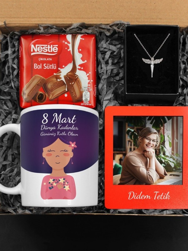 Kadınlar Gününe Özel Tasarım Kupa & Kişiye Özel Fotoğraf Çerçevesi & Nestle Çikolata & Gümüş Renk Kaplama Melek Kolye