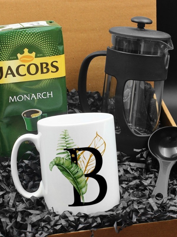 Kişiye Özel Harf Tasarımlı Kupa & French Press & 250g Jacobs Monarch Filtre Kahve Hediye Seti